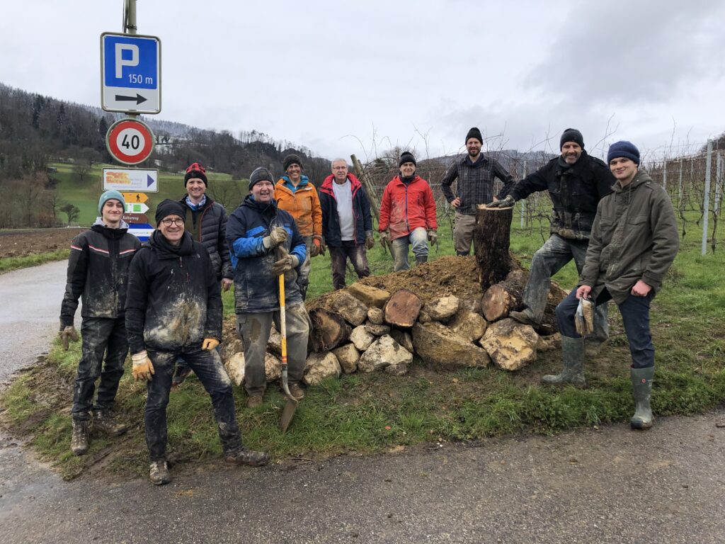 Rund 25 Personen haben fleissig gewirkt. So wurden in mehreren Gruppen unter anderem 2 Bäume, rund 150 Sträucher, einige Stauden gepflanzt und unzählige Samen ausgesät. Zudem wurden Kleinstrukturen aus Kalksteinen gebaut, am lichten Waldrand wurde mit viel Frauen- und Männerpower gejätet und gepickelt und auf der Experimentierfläche der Rebberflora wurden dominierende Kräuter und invasive Neophyten gejätet und viele Pfähle eingeschlagen.